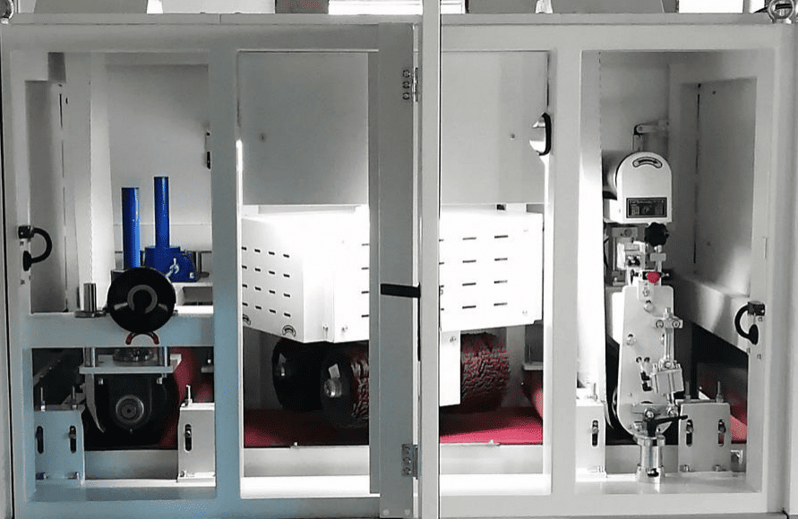 The internal structure of the 800RPT consists of one set of abrasive belts + four roller brushes + one polishing roller, forming processing system. The first abrasive belt is used for the initial removal of burrs from the workpiece surface; the second stage with four roller brushes performs brushing treatment, ensuring thorough deburring without damaging the surface; and finally, the polishing roller carries out precision polishing, making the surface smooth, uniform, and visually refined. With its well-designed structure, the Metal Finishing Machine enables efficient, stable, and continuous surface treatment.